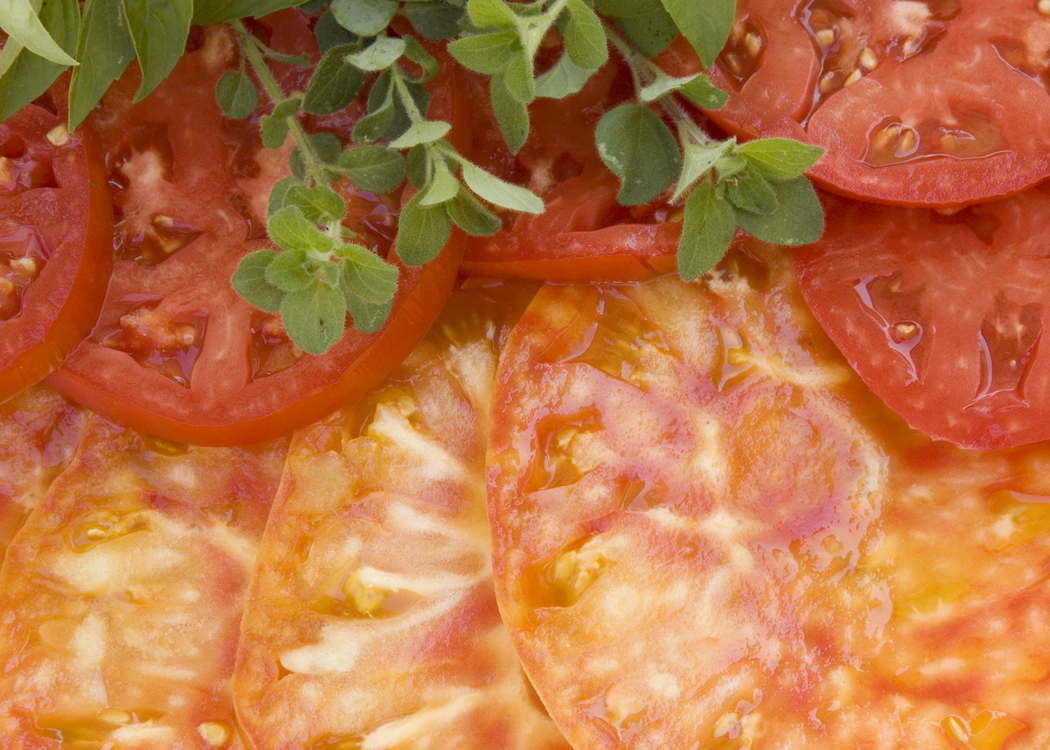 | Freshly Sliced Tomatoes Mr Stripey (lower) Delicious and three sprigs of Oregano |